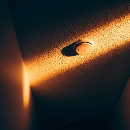 Geometric ceiling with recessed lighting and ductwork, bathed in cool, modern tones