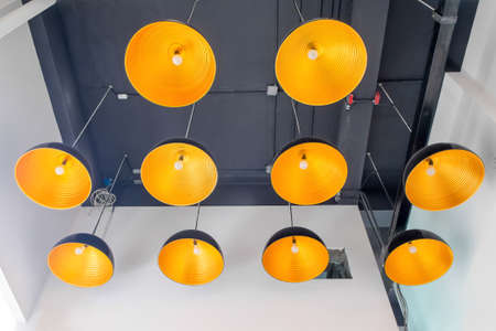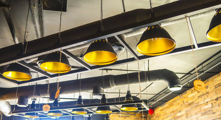 Warm lighting coming out from beautiful lamps on ceiling. Trendy cafe with nice environment