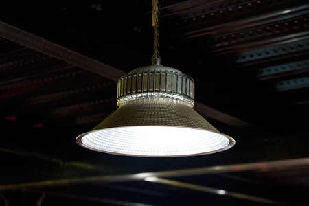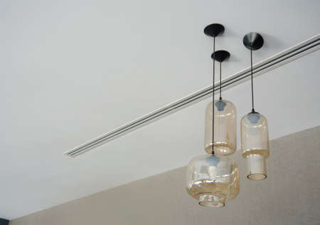 Lighting lamp is hanging at ceiling. Stylish lamp bulb in the interior