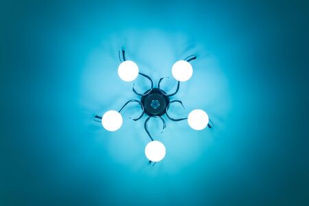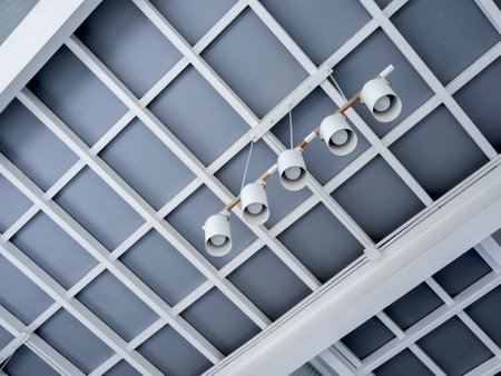 five spotlight hanging in cafe. Modern ceiling lamps set under the stylish construction building in living room in the white house. Stretch ceiling white and complex shape.