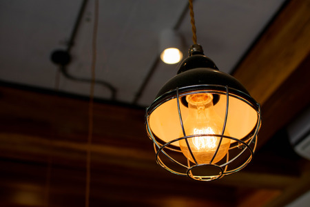 vintage lantern which has bulb inside and hanging on the ceiling of relaxing area, soft and selective focus.