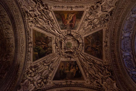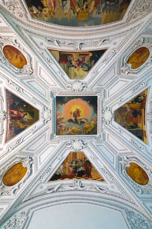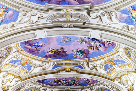 Ceiling mural with paintings inside Salzburg Cathedral with dim light
