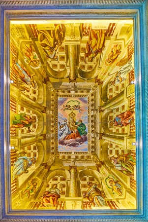 CERTOSA DI PAVIA, ITALY - APRIL 9, 2022: The fresco on the vault of Certosa Museum with perspective illusion, on April 9 in Certosa di Pavia, Italy