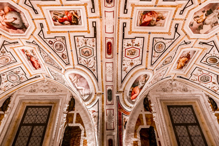 ROME, ITALY - JUNE 28, 2019: bottom view of ceiling with old frescoes in vatican