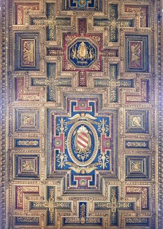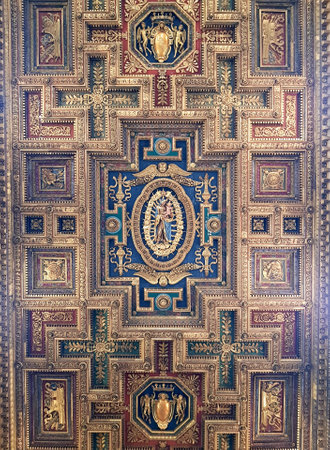 Rome, Italy - June 18, 2019: The golden wooden ceiling of the Basilica of Santa Maria in Trastevere