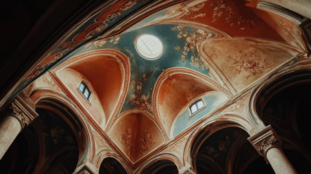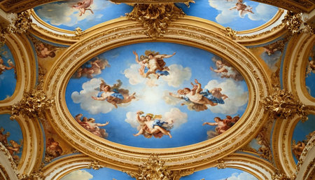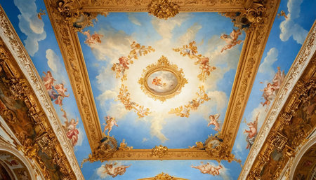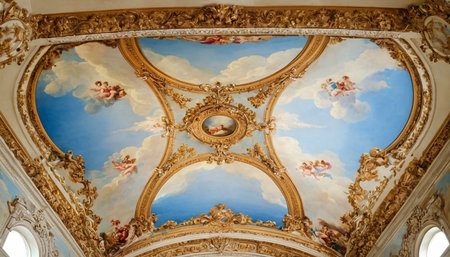 ceiling frescoes illuminated by soft lights, created with generative ai