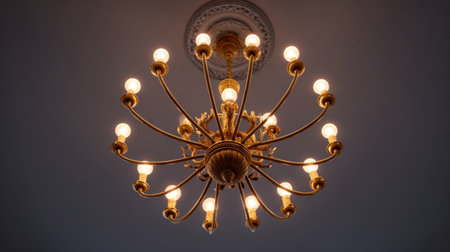 This stunning vintage chandelier features multiple light bulbs, creating a warm ambiance in a luxurious interior space, perfect for elegant home decor.