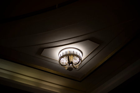 A ceiling lamp fixture casting warm, golden light in darkness, with soft shadows and a mysterious, moody atmosphere.