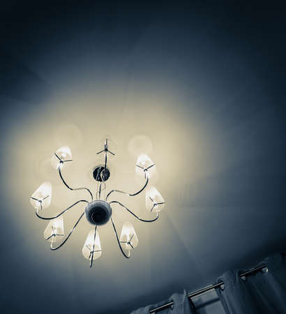 Chandelier in the interior. Vintage interior. Low light in the room. Ceiling details.