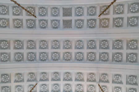 Beautiful ceiling with carved plaster decoration and marble walls. Architectural detail from the mosque Hassan II in Casablanca, Morocco.