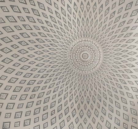 Explore the serenity of an intricately designed ceiling featuring ornate details and natural light from an octagonal skylight, creating a tranquil interior atmosphere.