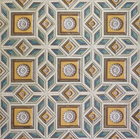 Explore the beauty of a historic ceiling adorned with intricate floral patterns and detailed craftsmanship, showcasing artistic elegance and architectural heritage.