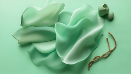 3D render of a green silk background with a rope and some stones