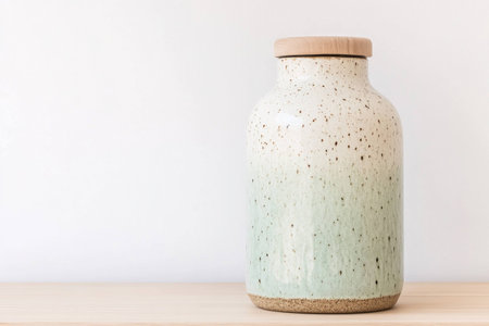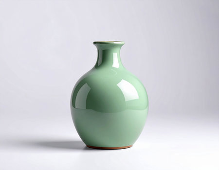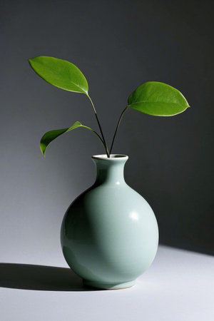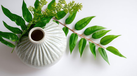 A beautiful ceramic vase holds vibrant green leaves, placed against a clean background. This image captures the essence of minimalistic design and tranquility.