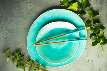 Ceramic plate and black wooden chopsticks for dinner in asian restaurant