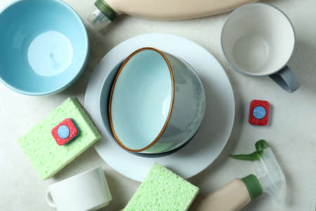 Concept of Dishwashing detergent accessories, top view