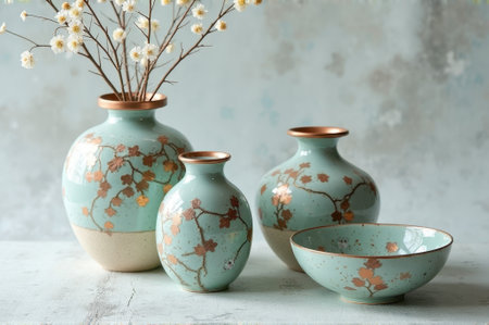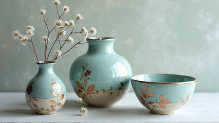 Elegant ceramic vases and bowl with floral designs on soft blue background. That the image is generated using AI.