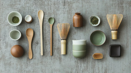 A serene and minimalist arrangement featuring essential tea preparation tools, including a matcha whisk, wooden spoons, and elegant bowls on a textured surface.