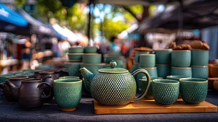 Ceramic teapots and cups for sale at flea market