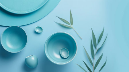 Soft pastel mint bowls are artistically arranged alongside smooth white stones and green leaves on a textured surface, creating a calming and serene atmosphere.