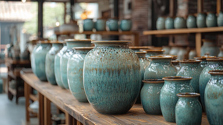 A collection of handmade ceramic vases and pots displayed on wooden shelves in a rustic decor shop. The earthy tones and artisanal craftsmanship create a warm and inviting shopping experience.