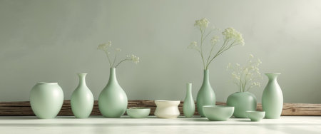 AI Generated. Elegant Green Decor with Unique Vases and Jewelry on Natural Background