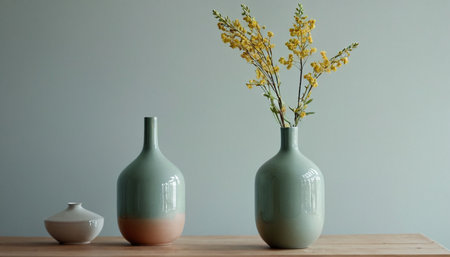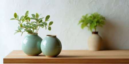 Two ceramic vases with green leaves on wooden surface and blurred background vase create calm and natural atmosphere