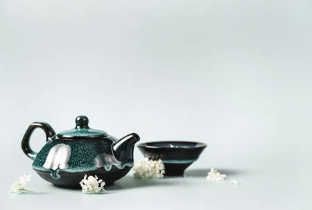 Green tea in a dark turquoise clay teapot and small cup decorated with white flowers on pastel background. Creative minimalist tea ceremony concept. Copy space.