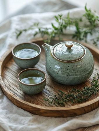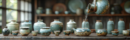 Traditional Tea Ceremony Setup with Handcrafted Pottery Collection.