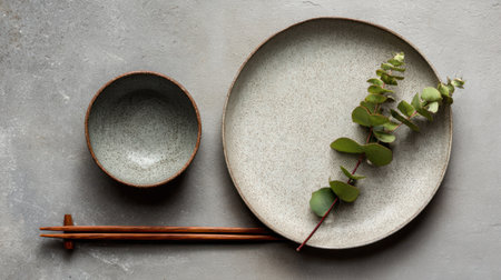 Minimalist zen table setting with plain ceramic dishes, wooden chopsticks, and a single sprig of greenery