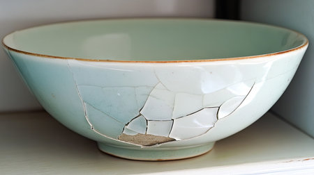 This image features a cracked ceramic bowl, showcasing intricate patterns and details. The bowl is displayed on a vintage shelf, highlighting its unique imperfections and artistry.