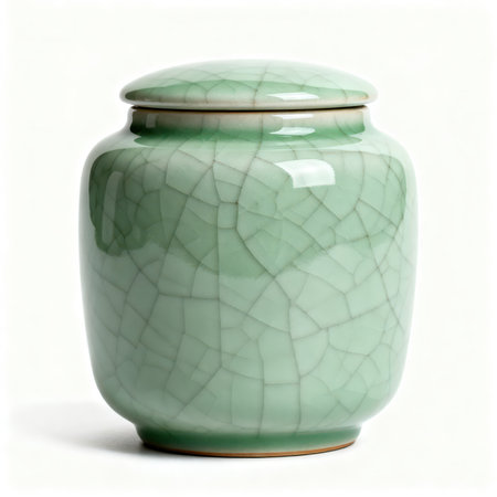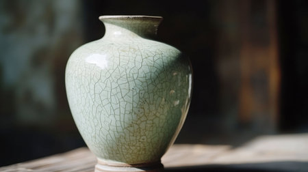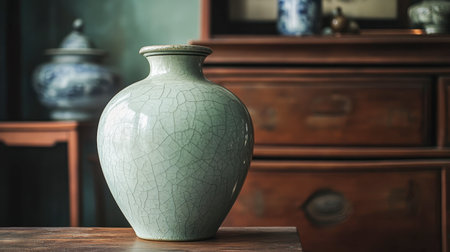 A beautifully crafted ceramic vase with a crackled green finish, elegantly placed on a wooden table in a vintage room, showcasing artisan craftsmanship and timeless design.