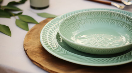 Two ceramic plates in soft green and gray rest on a subtle textured surface with a calming color palette. The arrangement highlights the minimalist design and craftsmanship.