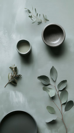 Muted gray bowls and delicate greenery are artfully arranged, showing subtle overlapping shapes in a serene, minimalist display that emphasizes harmony and tranquility.