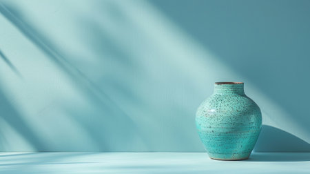 Turquoise ceramic vase sits on light blue surface with matching background