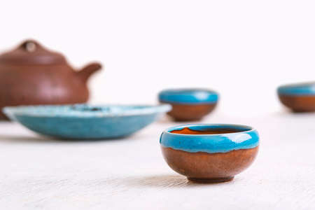Traditional japanese ceramic on rustic wooden background. Soft focus. Copy space.