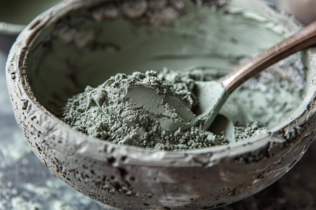 Digital artwork of bowl of green clay mixed with a coffee spoon, high quality, high resolution