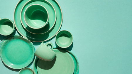 Green ceramic tableware on blue background. Top view, copy space