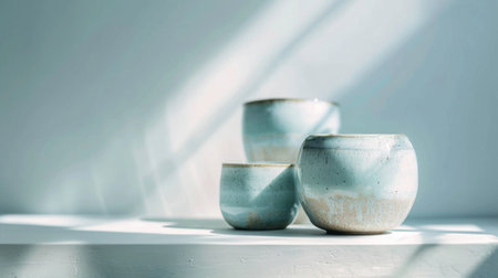 A collection of ceramic vases casting artistic shadows against a light blue background. Ideal for themes of interior design, decor, and artistic expression.