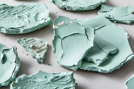 Cracked Pieces, Pastels Fragments on Light Grey Background Textural Abstract Image.