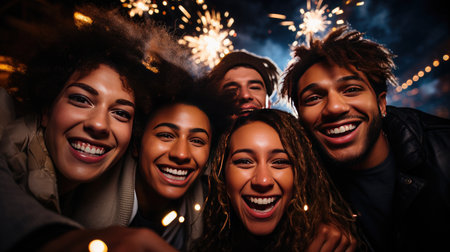 group of diverse friends young men and woman happy on new year's eve party with champagne and fireworks in the background