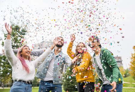Happy friends celebrating throwing confetti in the air, Young people having outdoor party, Students having fun together at college campus, Youth culture.