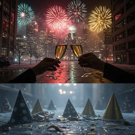 Happy New Year and Merry Christmas! Collage of a couple clinking glasses of champagne with fireworks in the city.