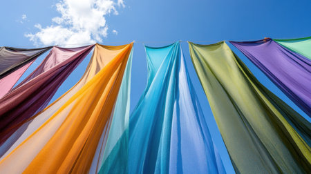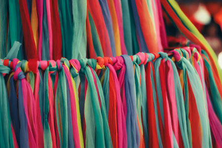 Colorful fabric drapes and ribbons fluttering in the breeze at a festive open-air market