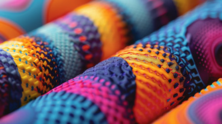 Rolled clothes of various colors creating a visually appealing textile pattern, ideal for fashion or retail related projects