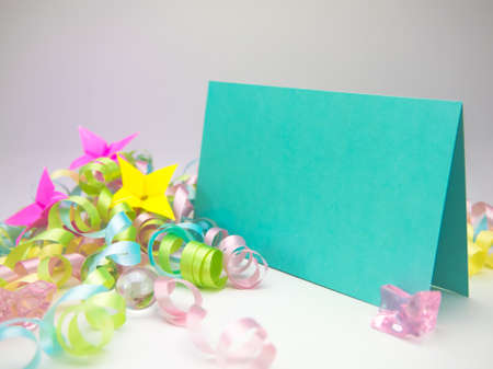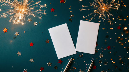 Blank cards are placed on a teal surface surrounded by sparkling stars and festive elements, creating an exciting atmosphere for a celebration at night.