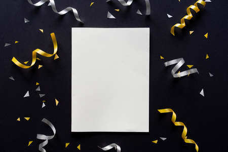 close u top view on blank white paper card with gold and silver color rolling ribbon and confetti on black background for merry christmas, happy new year festival concept