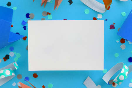 Children kids party flat lay confetti with party hats and balloons
