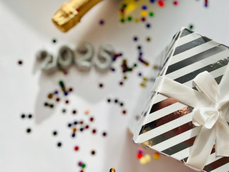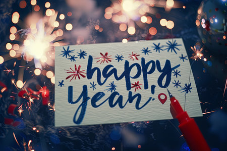 Celebrate New Year's Eve with a beautifully arranged scene featuring sparkling champagne, glowing lights, and a heartfelt greeting card, perfect for joyful moments.