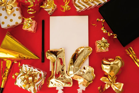 14 February. Lots of gifts, golden 14 balloons, note for Valentine's Day isolated on red background. Holidays concept. The view from the top.